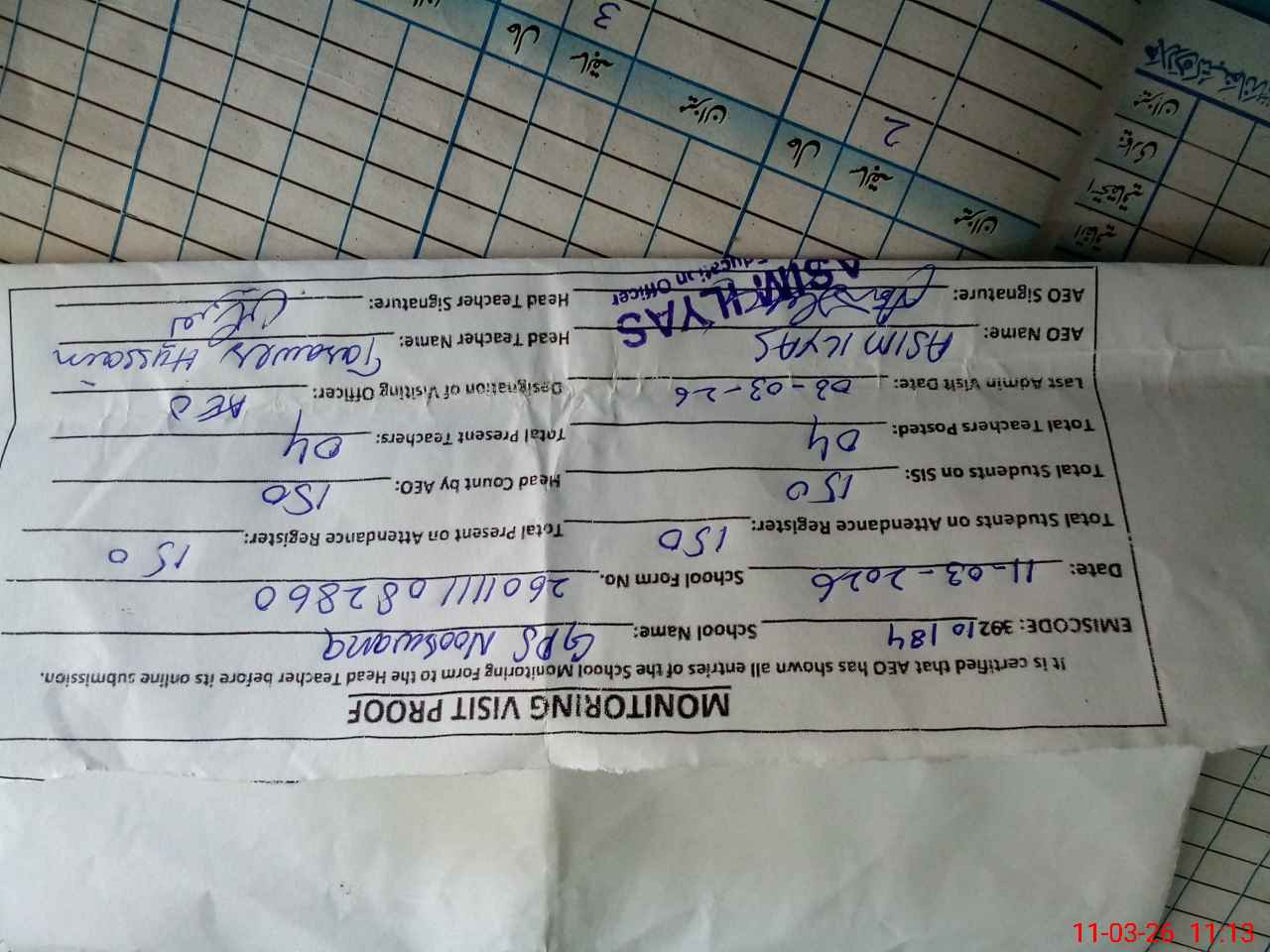 | Attendance Register | Head Teacher | MEA with School | Visit Proof |