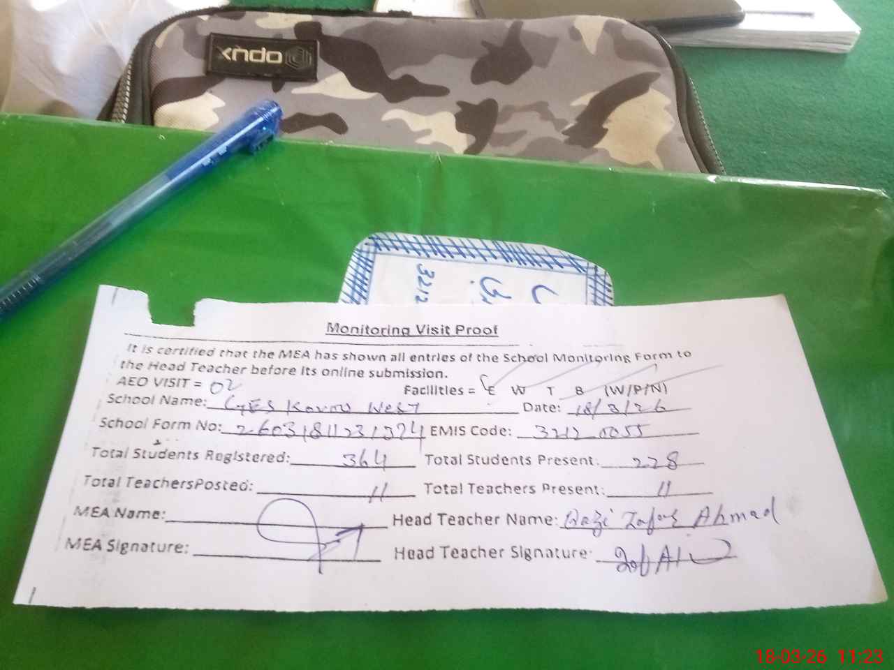| Attendance Register | Head Teacher | MEA with School | Visit Proof |