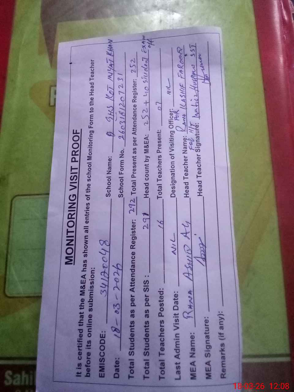 | Attendance Register | Head Teacher | MEA with School | Visit Proof |