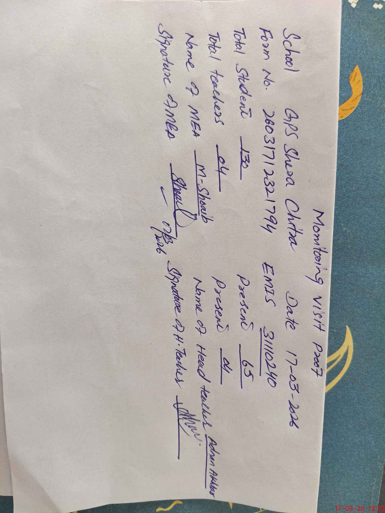 | Attendance Register | Head Teacher | MEA with School | Visit Proof |