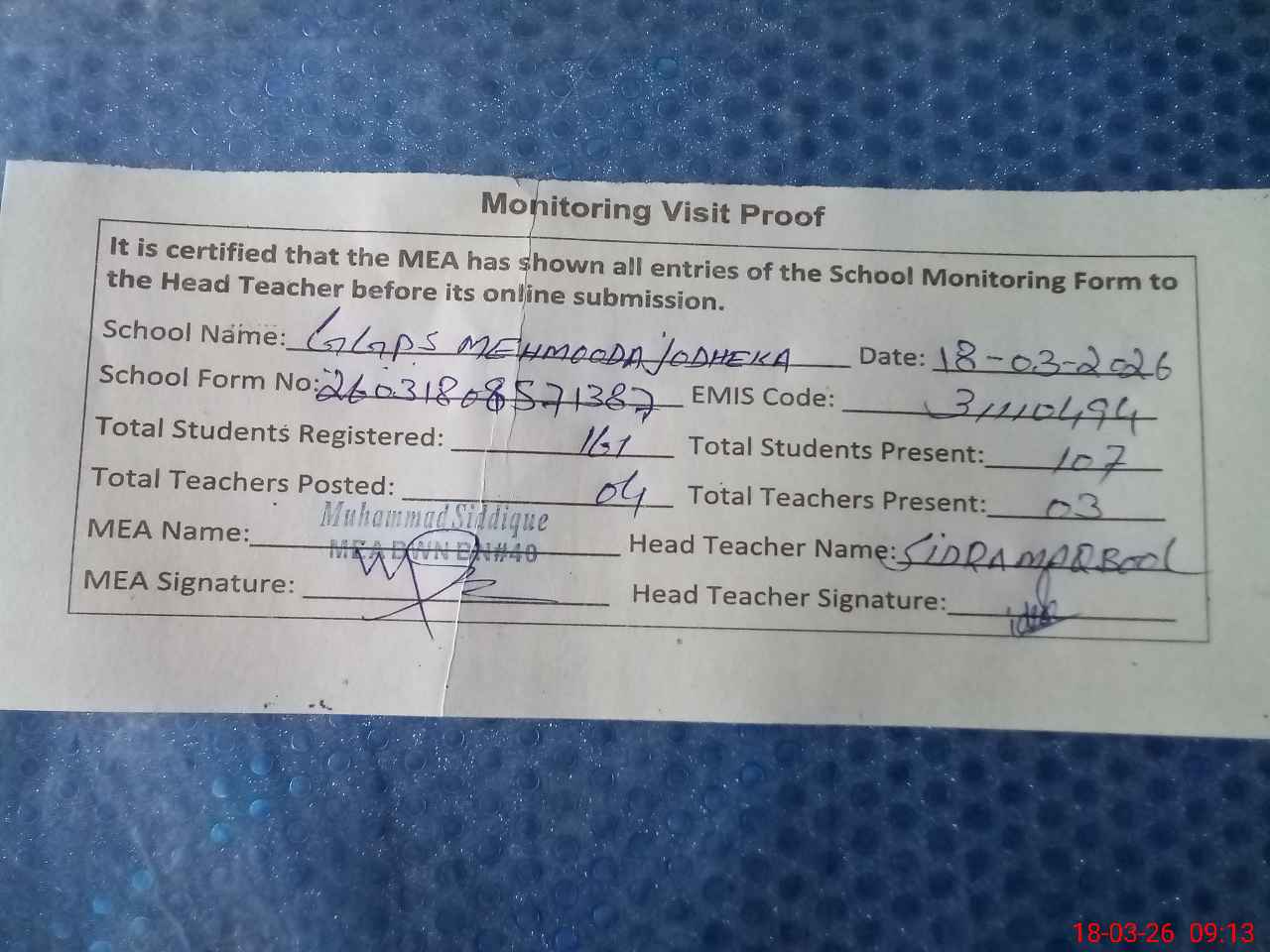 | Attendance Register | Head Teacher | MEA with School | Visit Proof |