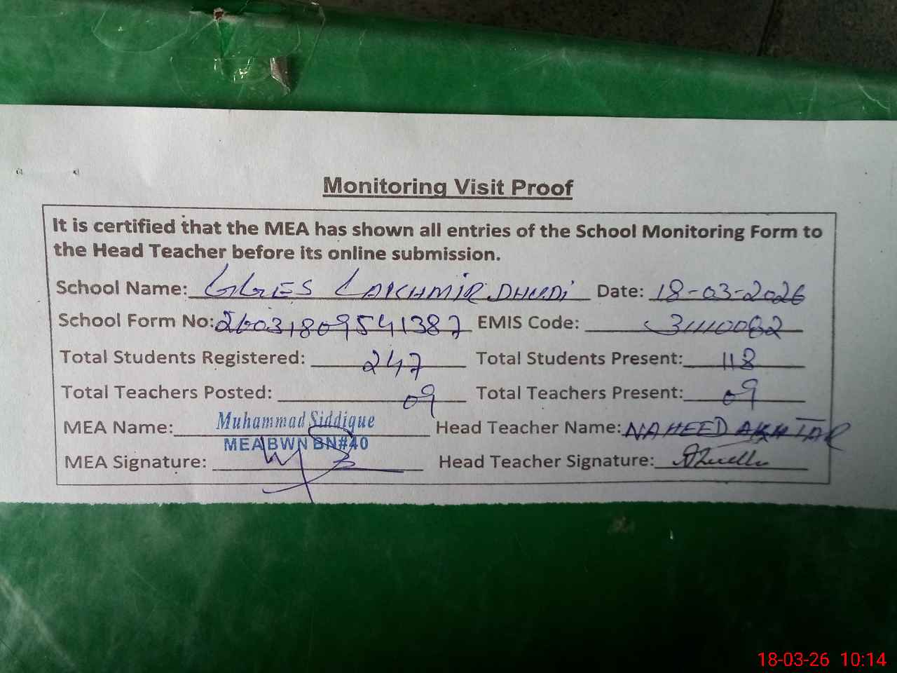 | Certified that this School was Inspected by the Undersigned MEA/DMO Today and the Information Stated Above is as Per Record. | |||||