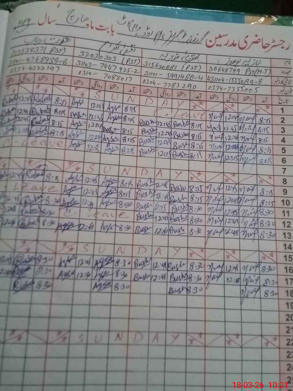 | CNIC | Full Name | Designation | R/C | Absence During Last Calender Month |