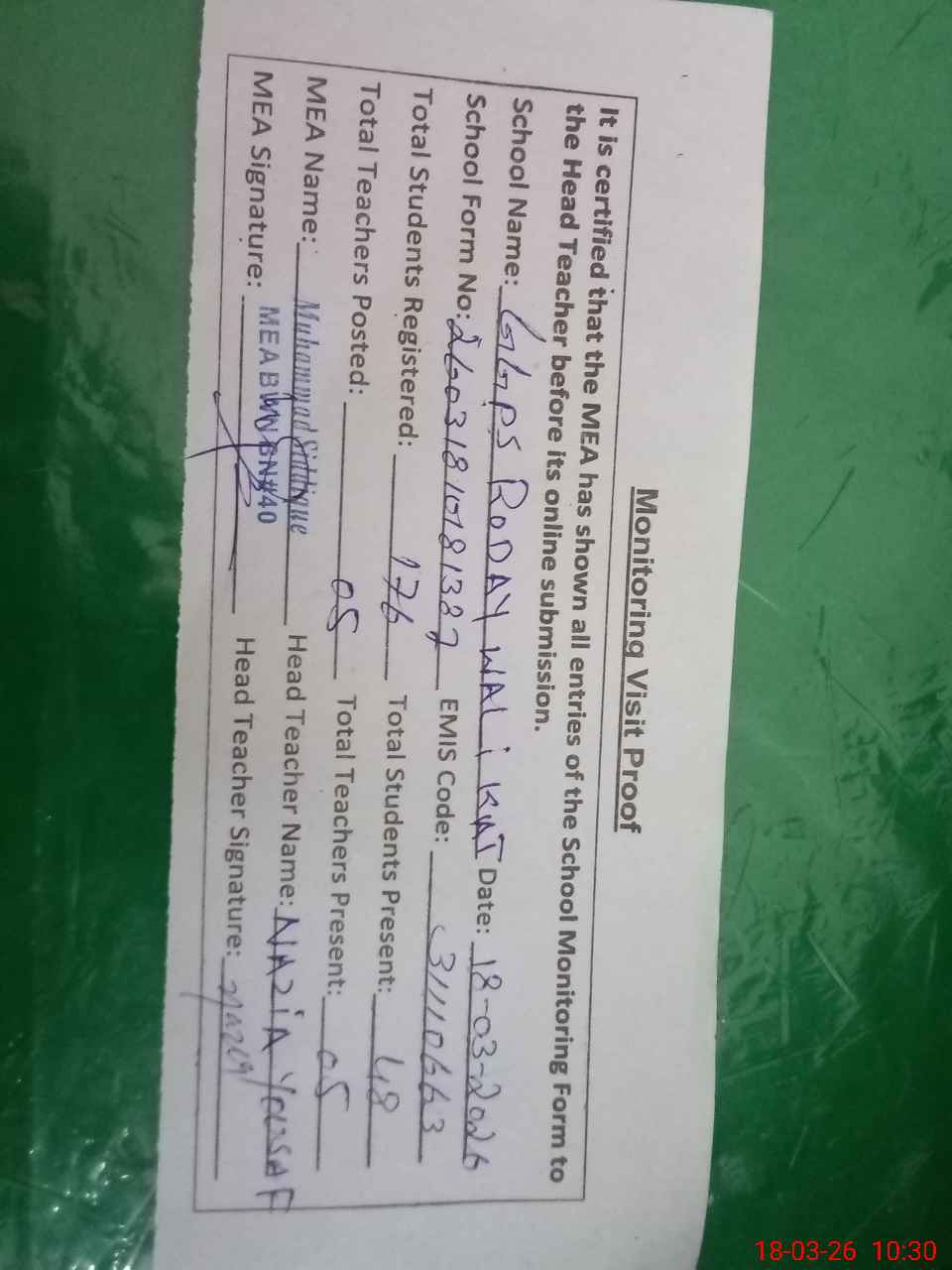 | Attendance Register | Head Teacher | MEA with School | Visit Proof |