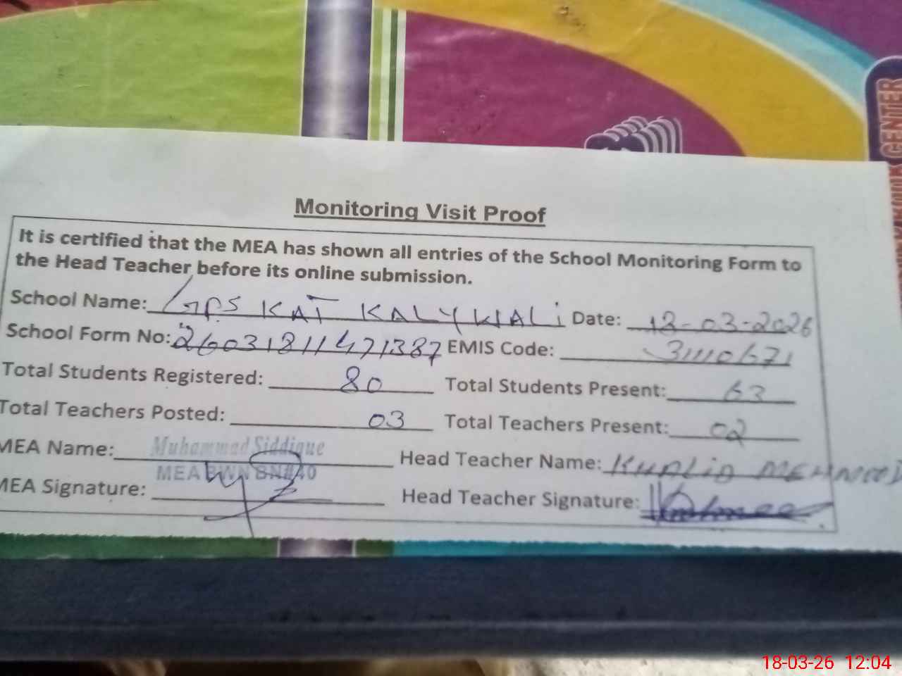 | Attendance Register | Head Teacher | MEA with School | Visit Proof |