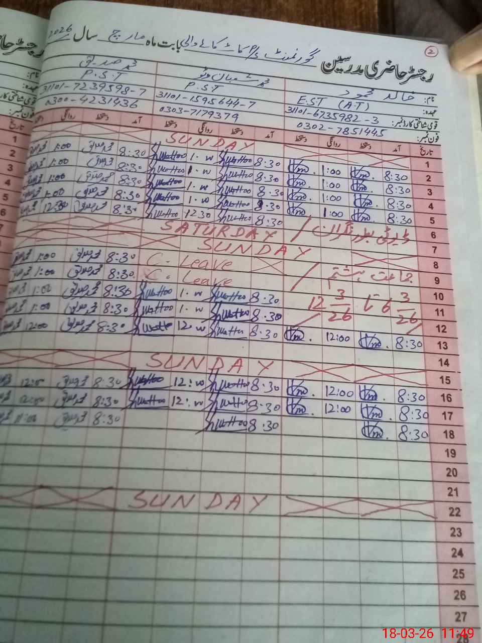 | CNIC | Full Name | Designation | R/C | Absence During Last Calender Month |