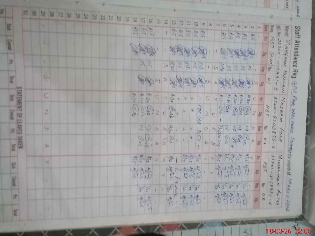 | CNIC | Full Name | Designation | R/C | Absence During Last Calender Month |