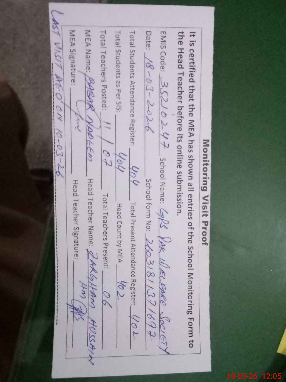 | Attendance Register | Head Teacher | MEA with School | Visit Proof |