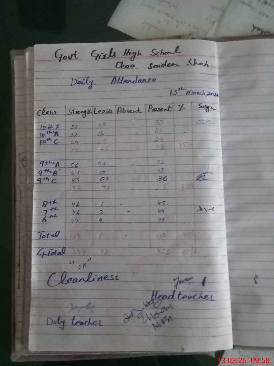 | No. of Students Present - Female | 0 | 0 | 0 | 0 | 0 | 0 | 0 | 43 | 44 | 45 | 115 | 79 | 326 | |||