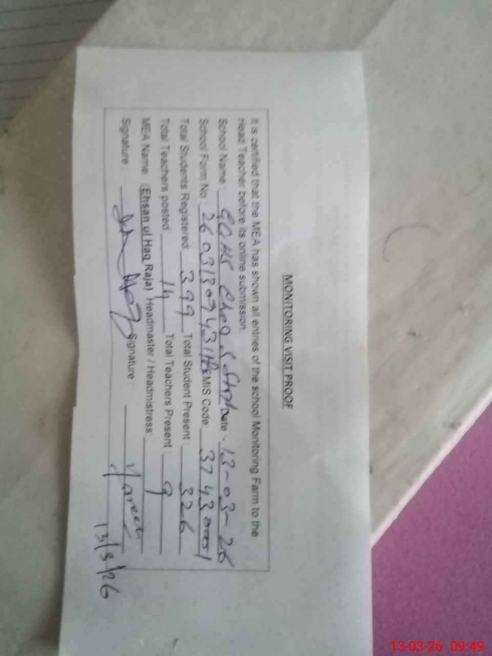 | Attendance Register | Head Teacher | MEA with School | Visit Proof |