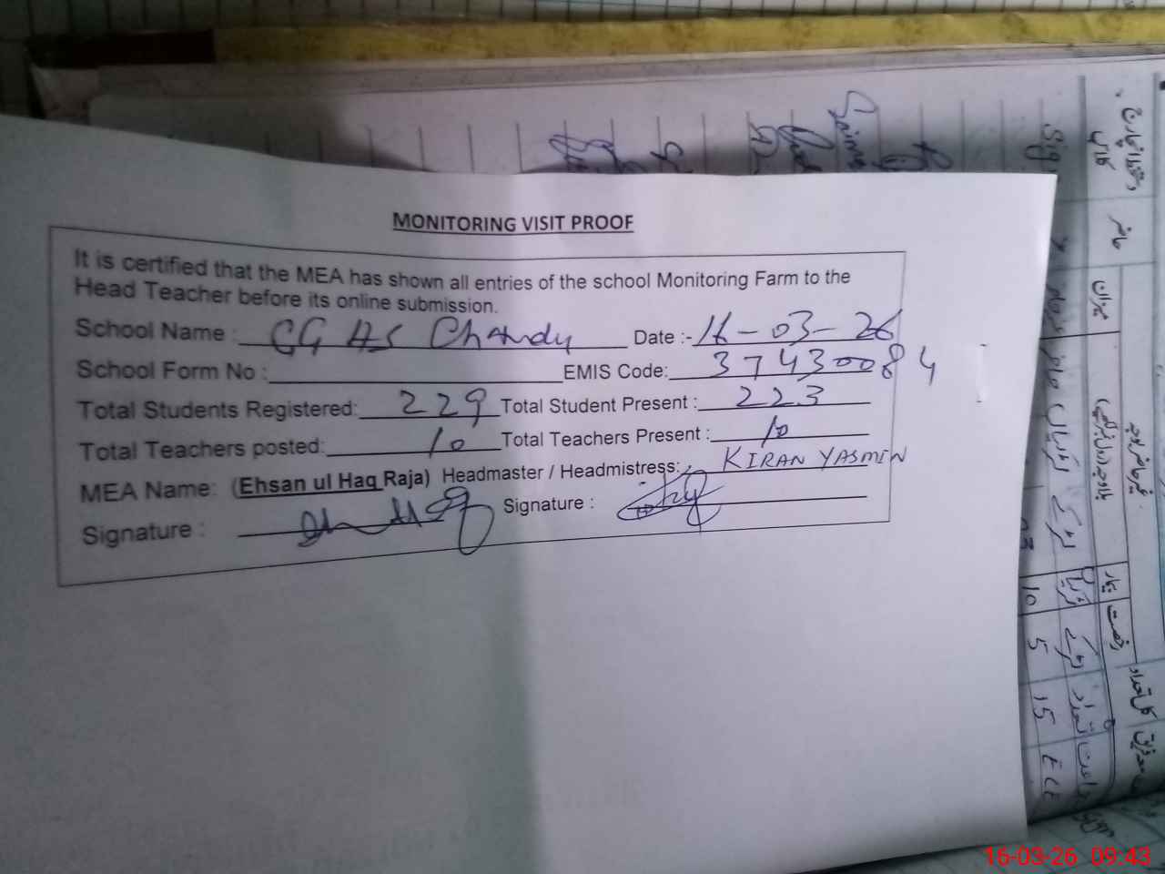 | Attendance Register | Head Teacher | MEA with School | Visit Proof |
