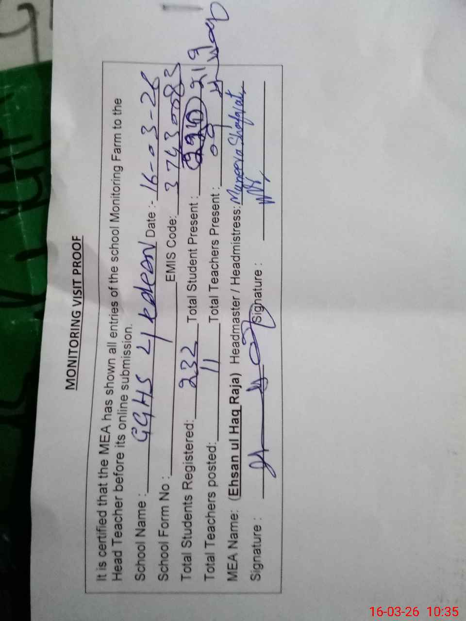| Attendance Register | Head Teacher | MEA with School | Visit Proof |