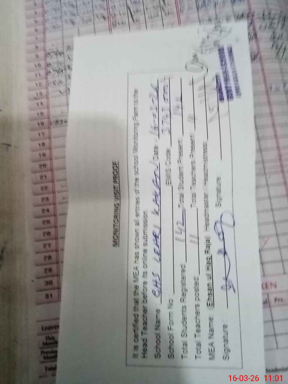| Attendance Register | Head Teacher | MEA with School | Visit Proof |