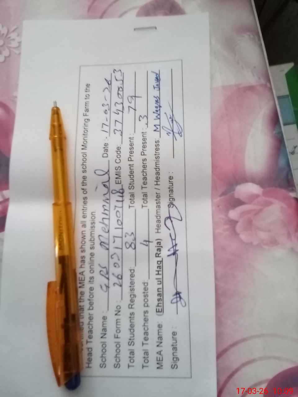| Attendance Register | Head Teacher | MEA with School | Visit Proof |