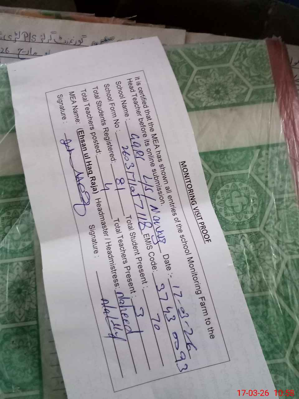 | Attendance Register | Head Teacher | MEA with School | Visit Proof |