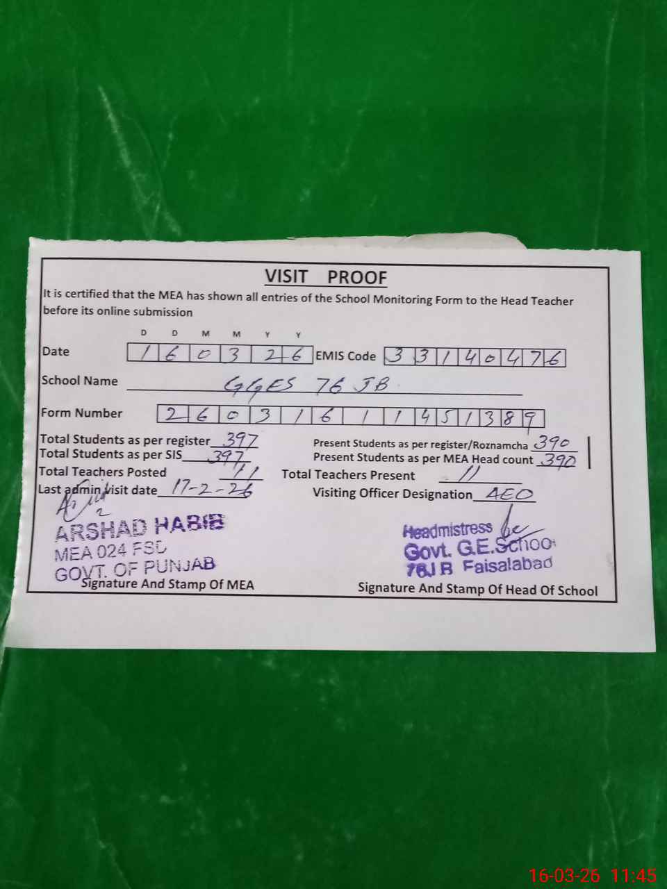 | Attendance Register | Head Teacher | MEA with School | Visit Proof |