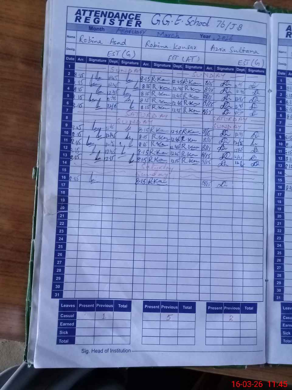 | Leave | Duty | Absent | Maternity | Medical | Ex- Pak |