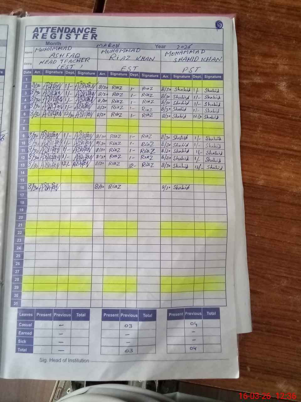 | CNIC | Full Name | Designation | R/C | Absence During Last Calender Month |