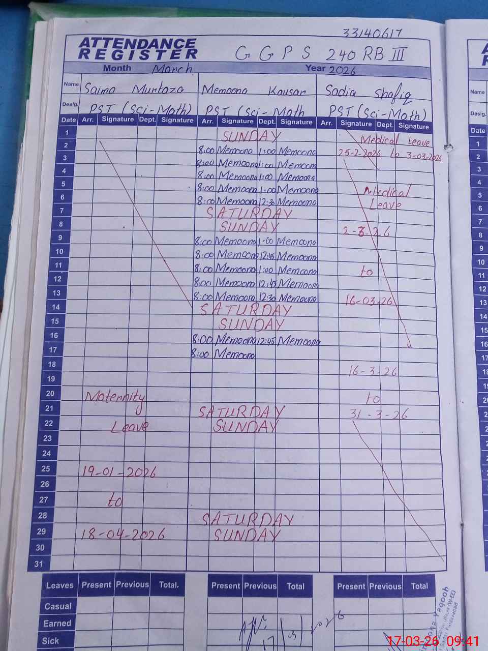 | 33**** | Sa**** Mu**** | PST Science/Maths | Regular | 0 | 0 | 0 | 0 | 0 | 0 | 0 | 0 | 0 | Maternity |