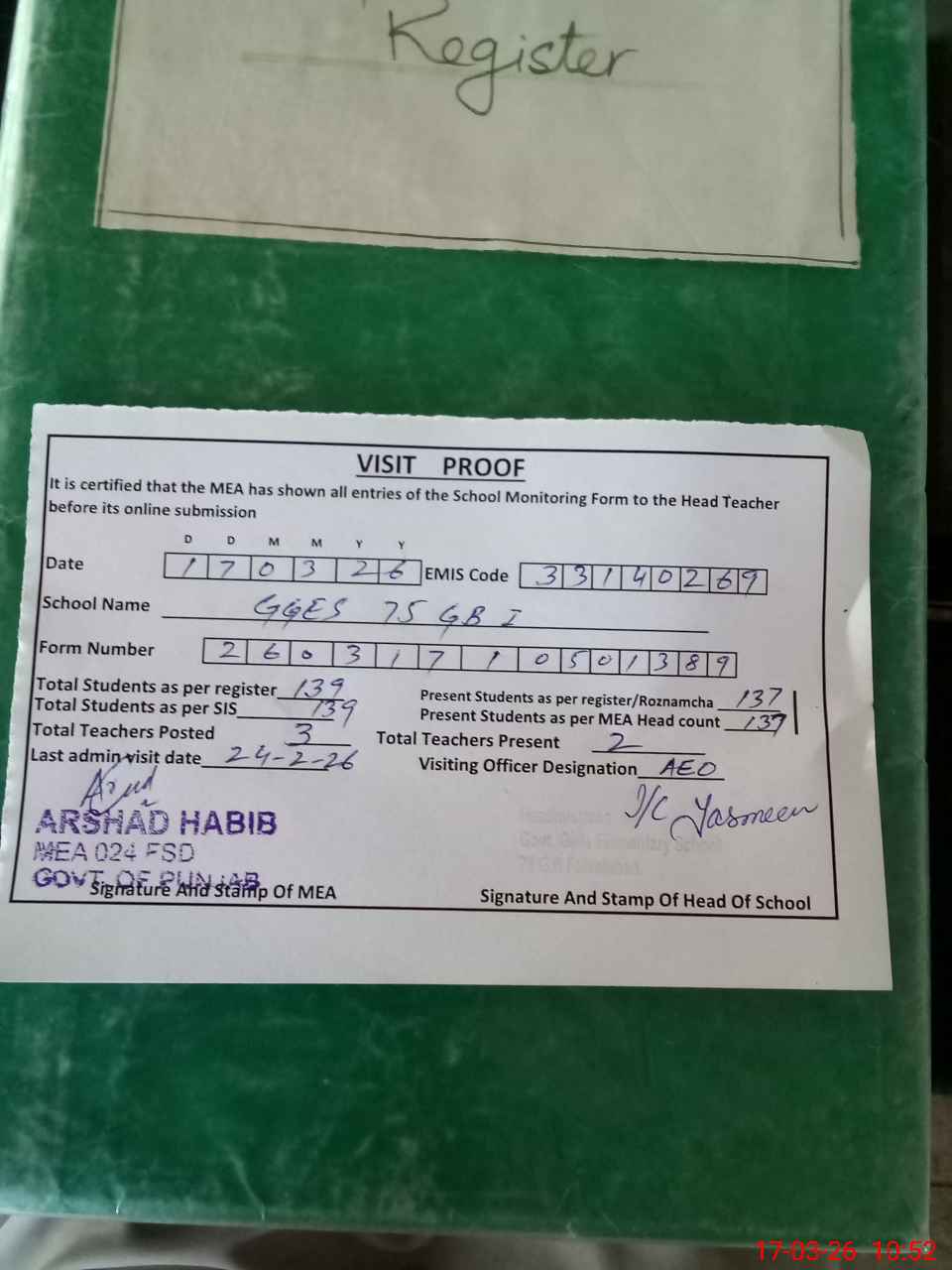 | EMIS Code: 33140269 | Name of School: GGES CHAK NO 75 GB I | |||