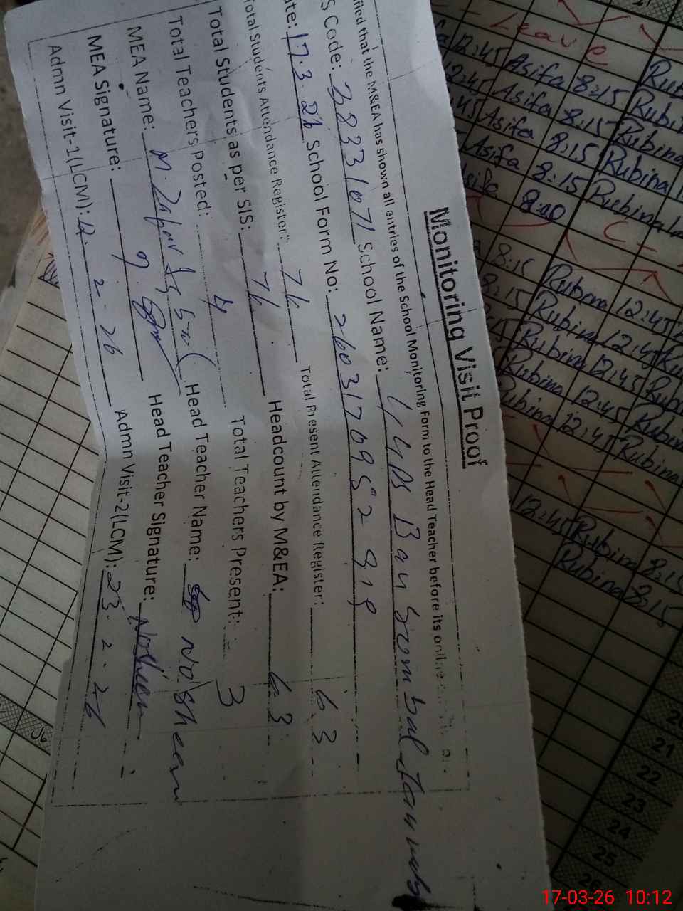 | Attendance Register | Head Teacher | MEA with School | Visit Proof |