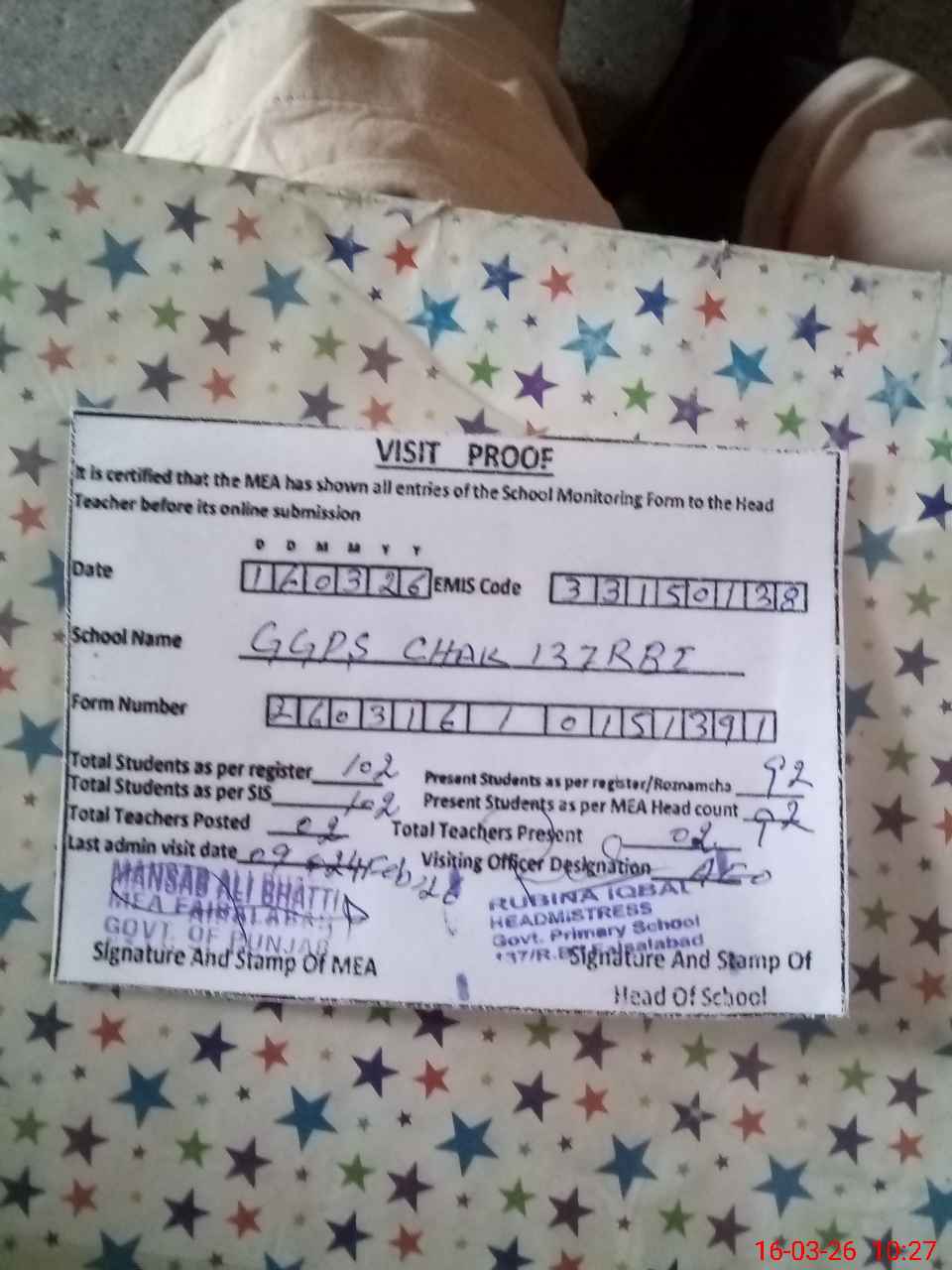 | Attendance Register | Head Teacher | MEA with School | Visit Proof |