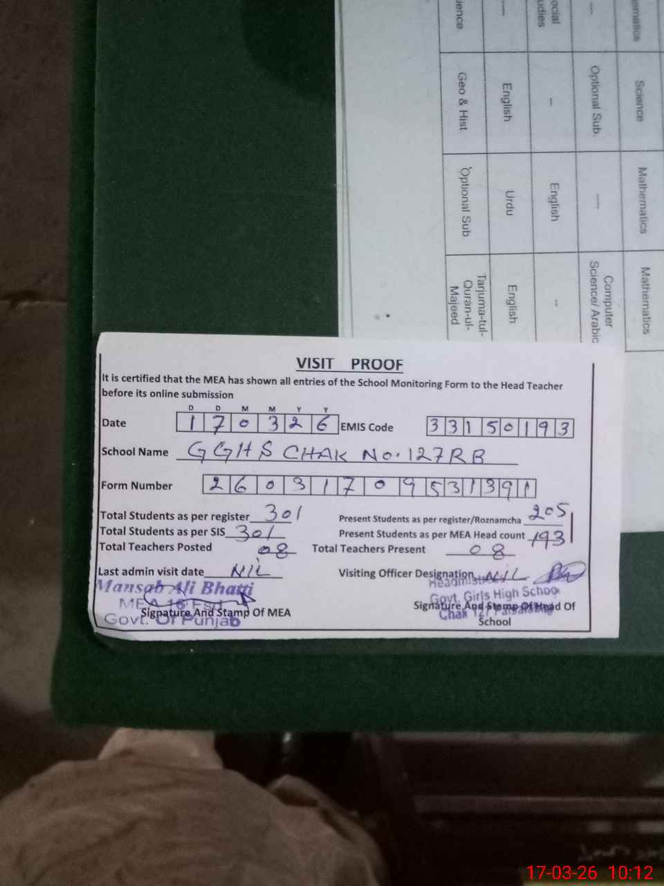 | EMIS Code: 33150193 | Name of School: GGHS CHAK NO 127 RB BHLOL PUR | |||
