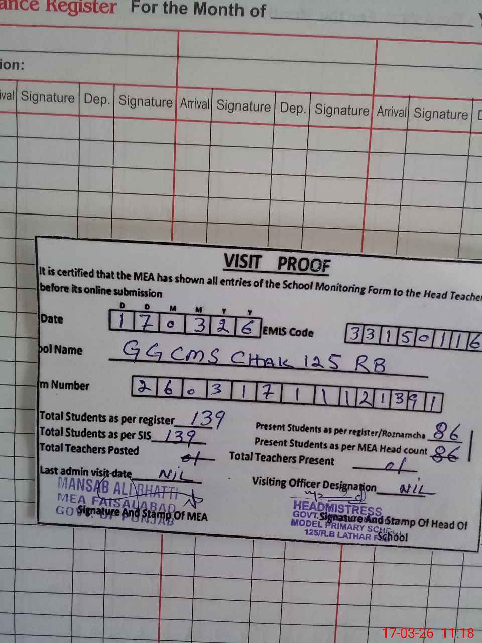 | Attendance Register | Head Teacher | MEA with School | Visit Proof |