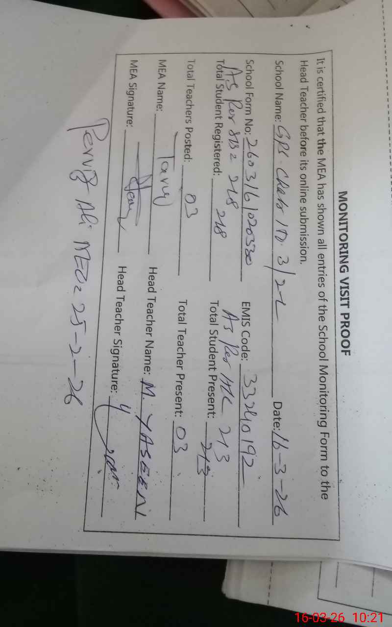 | EMIS Code: 33240192 | Name of School: GPS CHAK NO 3/2 L | |||