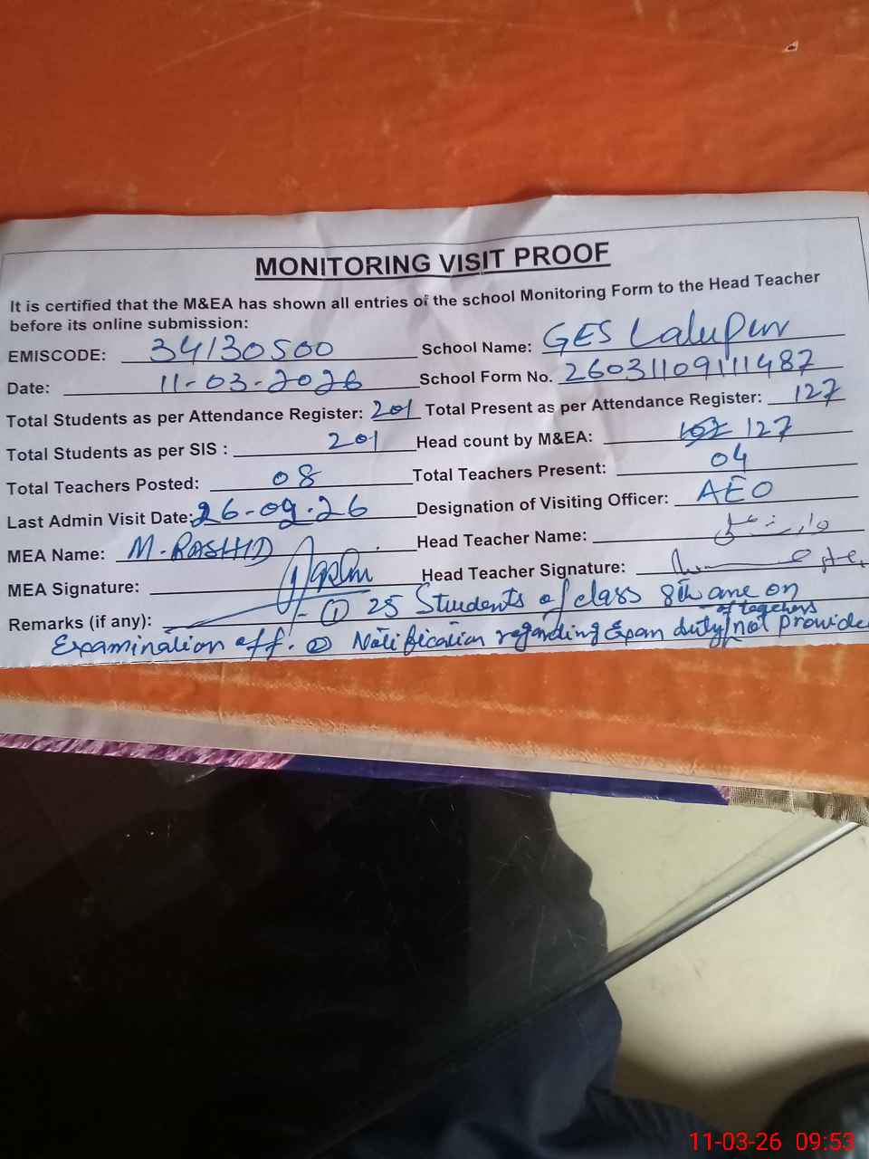 | Monitoring Date: 11-03-2026 | Start Time: 11-03-2026 09:11 AM | End Time: 11-03-2026 09:54 AM | Name of MEA: K-**** Ra**** | |