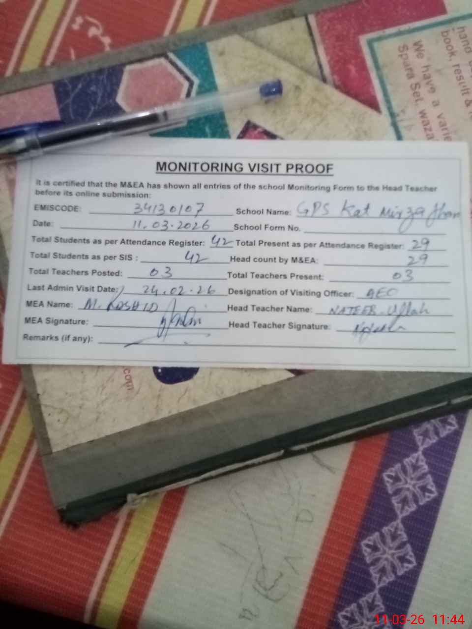| Attendance Register | Head Teacher | MEA with School | Visit Proof |