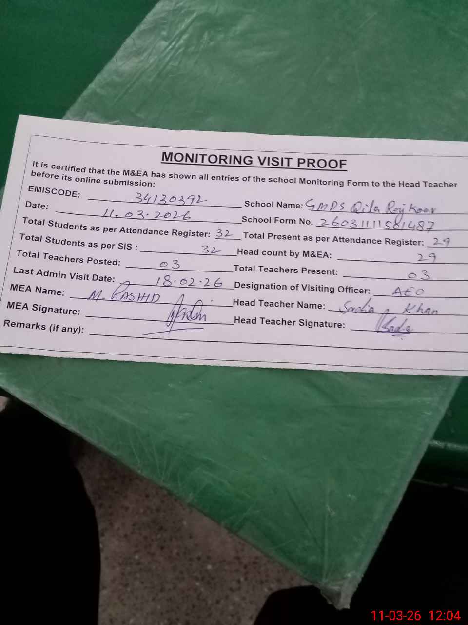 | Attendance Register | Head Teacher | MEA with School | Visit Proof |