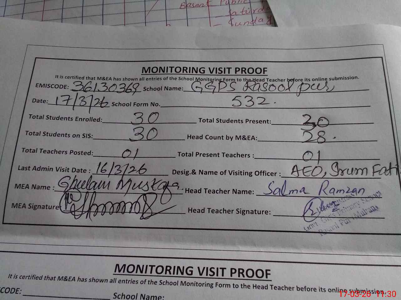 | EMIS Code: 36130369 | Name of School: GGPS RASOOL PUR P/O JHOK VENCE | |||