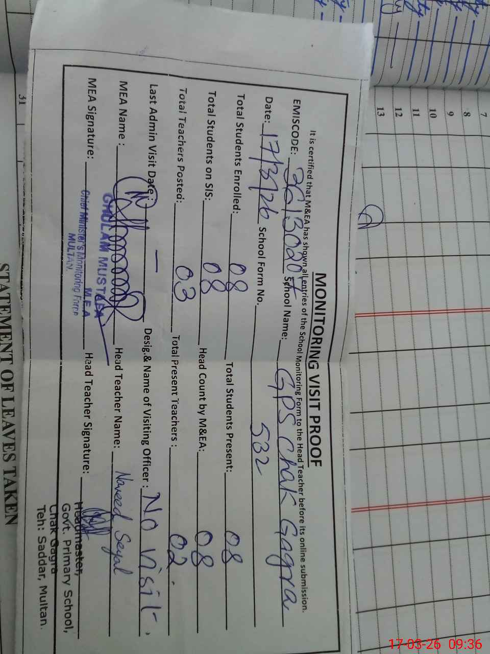 | EMIS Code: 36130207 | Name of School: GPS CHAK GAGRA P/O JHOK VAINCE MOZA CHAK GAGRA MULTAN | |||