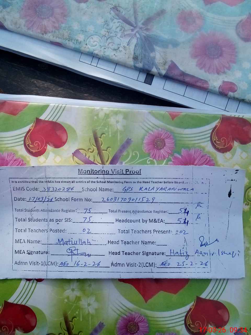| EMIS Code: 38320286 | Name of School: GPS KALAYARAN WALA | |||
