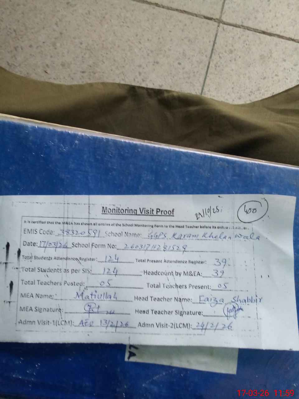 | Attendance Register | Head Teacher | MEA with School | Visit Proof |