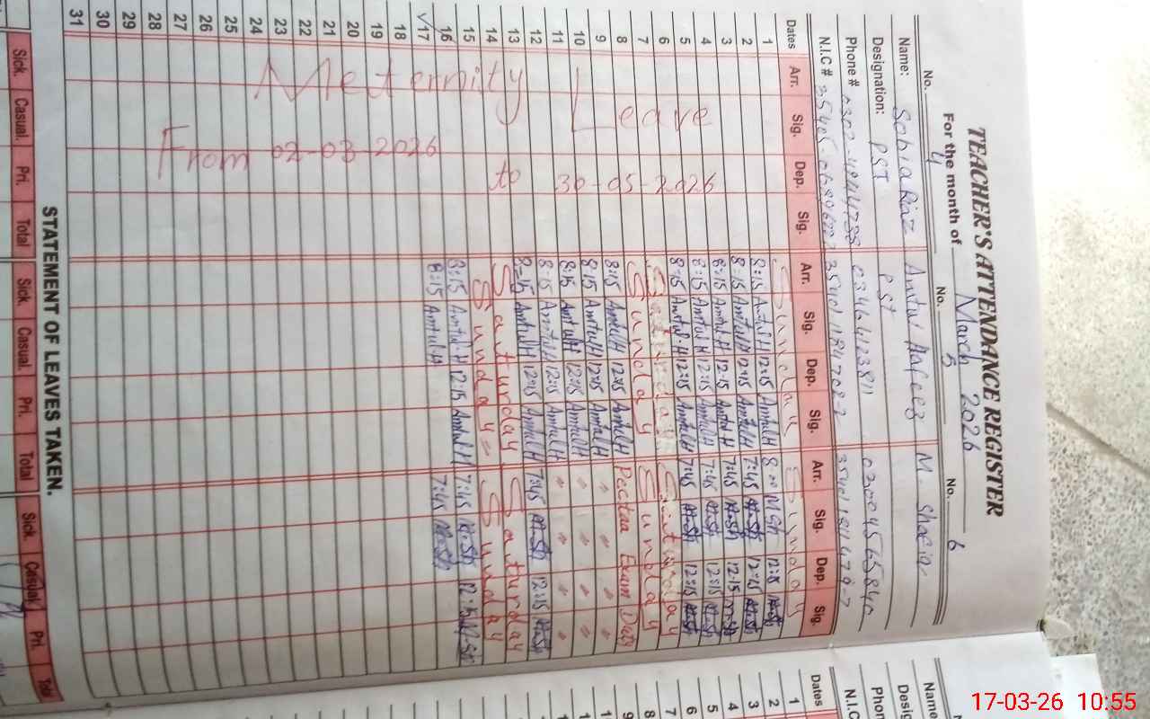 | 35**** | So**** Ri**** | PST Science/Maths | Regular | 2 | 0 | 0 | 0 | 0 | 0 | 0 | 0 | 2 | Maternity |