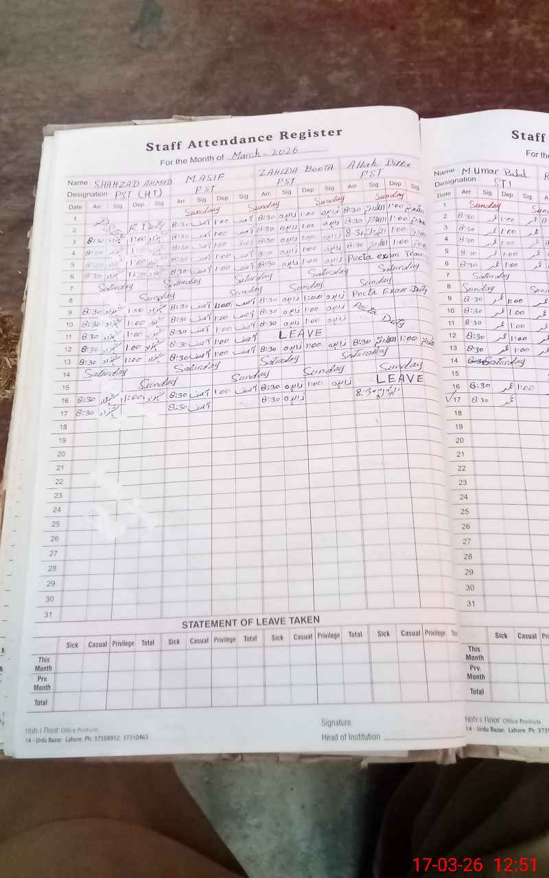 | Name: SH**** AH**** Designation: (School Headmaster's/Headmistress's) PST Phone/Cell Number: 03**** |