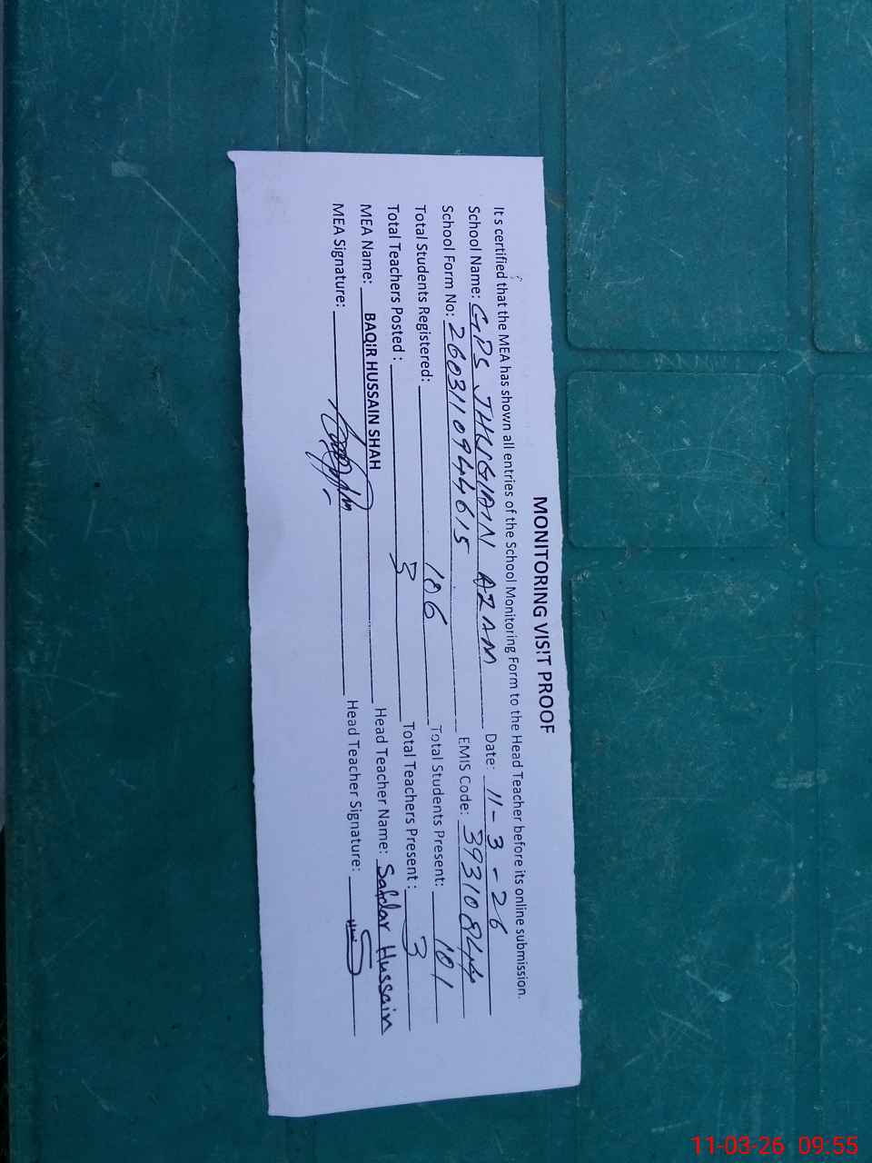 | Attendance Register | Head Teacher | MEA with School | Visit Proof |