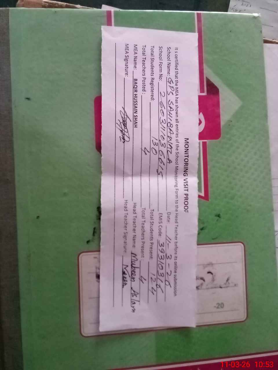 | Attendance Register | Head Teacher | MEA with School | Visit Proof |