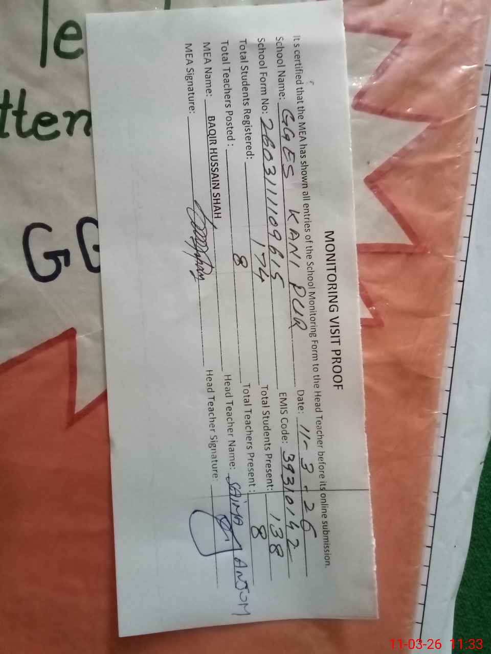 | Attendance Register | Head Teacher | MEA with School | Visit Proof |