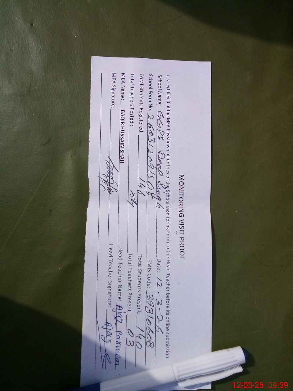 | Attendance Register | Head Teacher | MEA with School | Visit Proof |