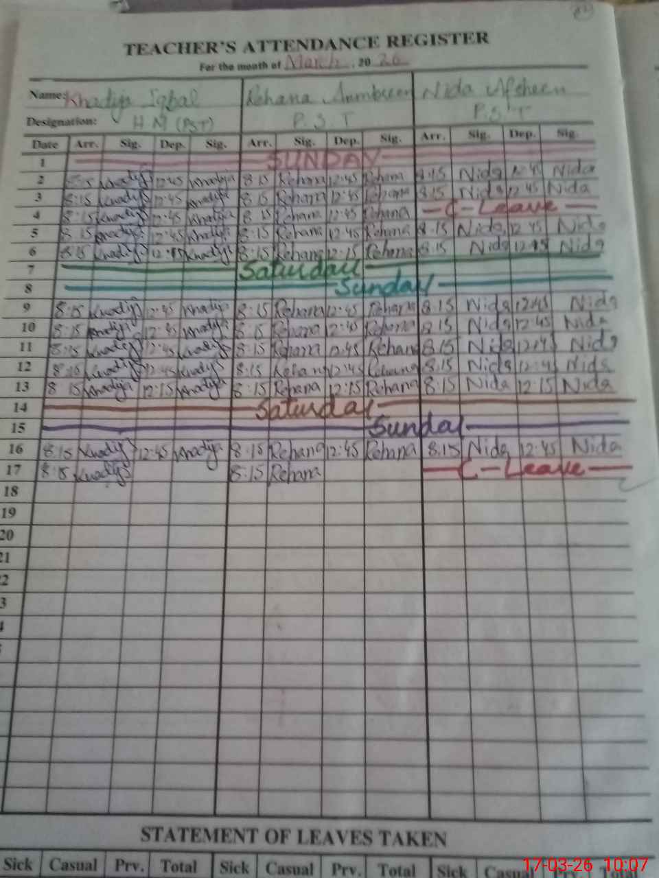 | Leave | Duty | Absent | Maternity | Medical | Ex- Pak |