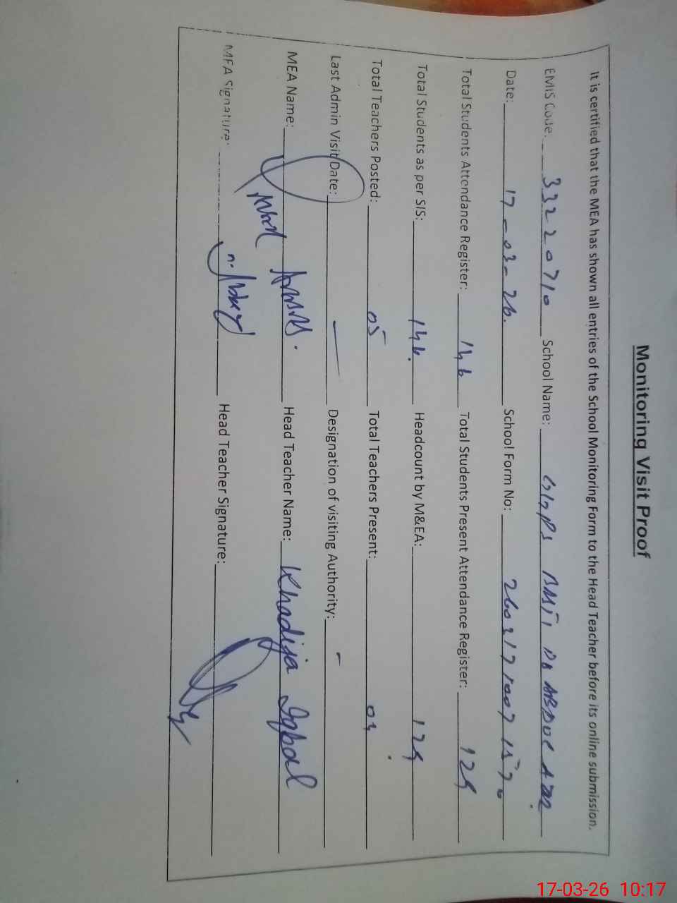 | Attendance Register | Head Teacher | MEA with School | Visit Proof |