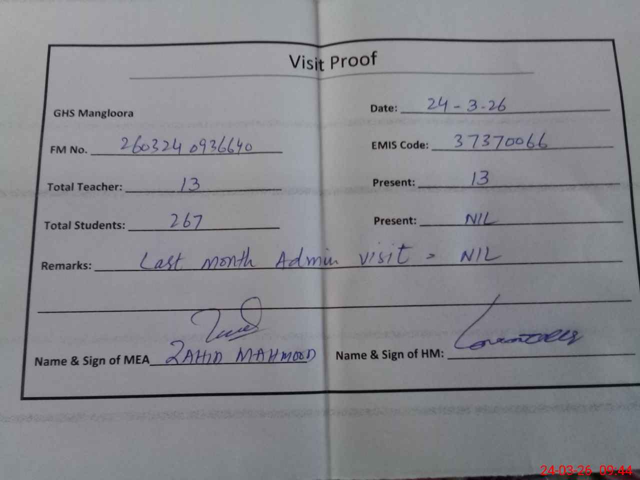 | Certified that this School was Inspected by the Undersigned MEA/DMO Today and the Information Stated Above is as Per Record. | |||||