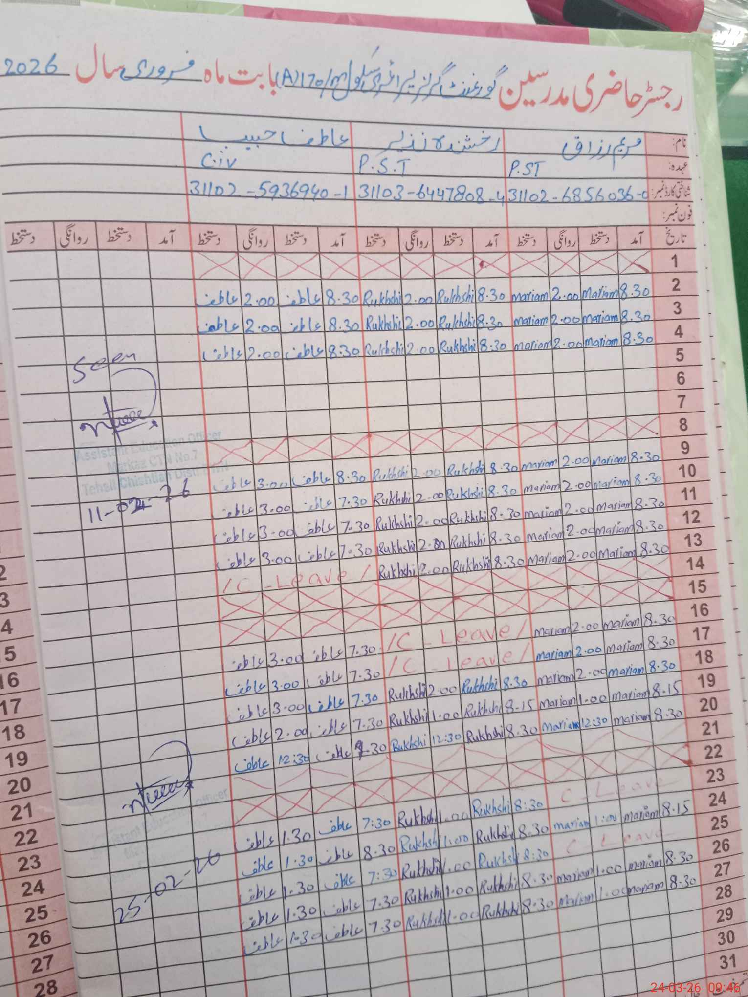 | CNIC | Full Name | Designation | R/C | Absence During Last Calender Month |