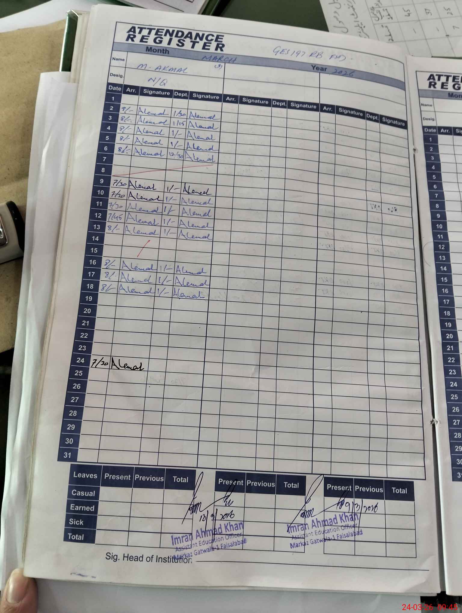 | Monitoring Date: 24-03-2026 | Start Time: 24-03-2026 09:07 AM | End Time: 24-03-2026 09:55 AM | Name of MEA: Im**** Ah**** Kh**** | |