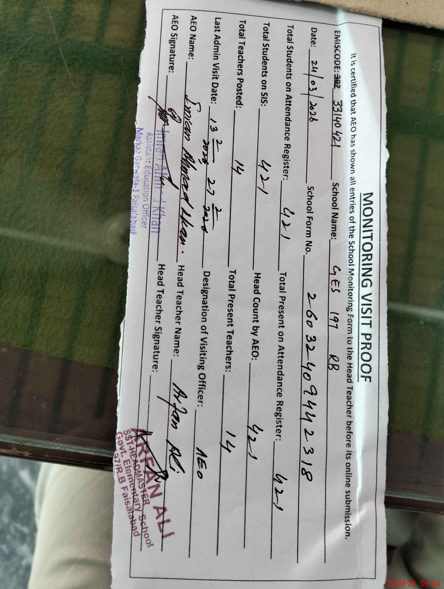 | Attendance Register | Head Teacher | MEA with School | Visit Proof |