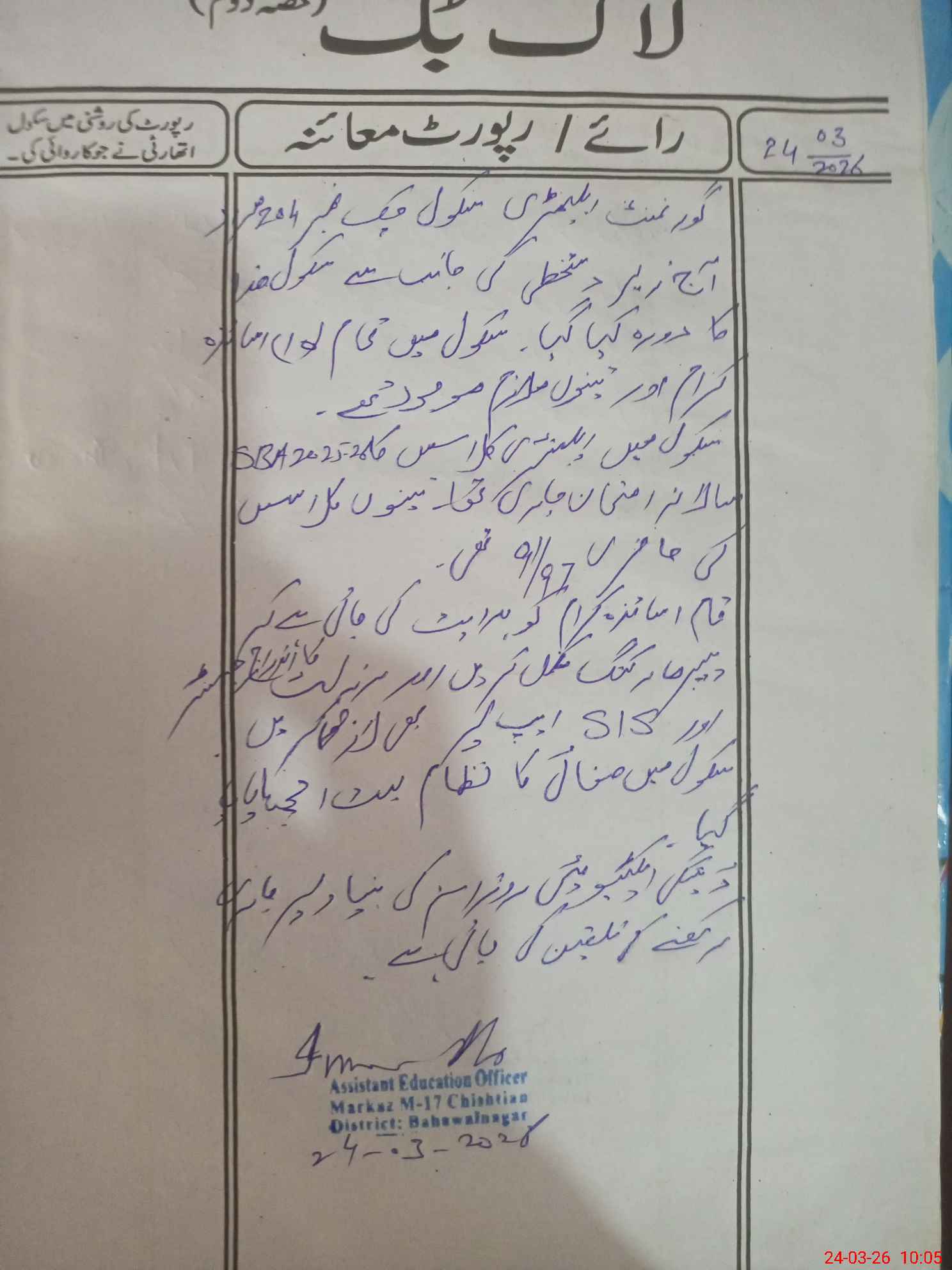 | District: BAHAWALNAGAR | Tehsil: CHISHTIAN | Markaz: MALE-17 | Level: Middle | |