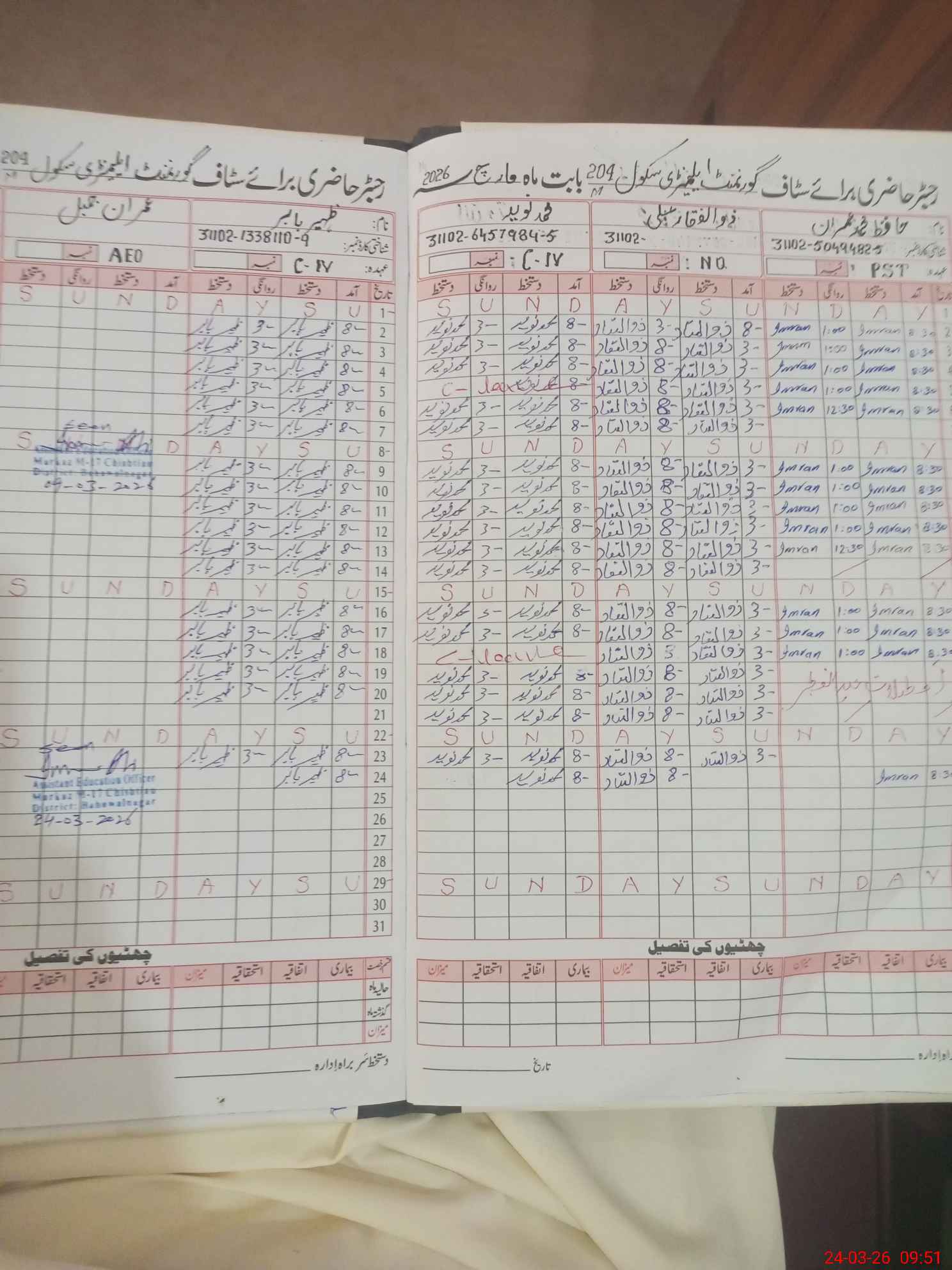 | CNIC | Full Name | Designation | R/C | Absence during last cal. month |